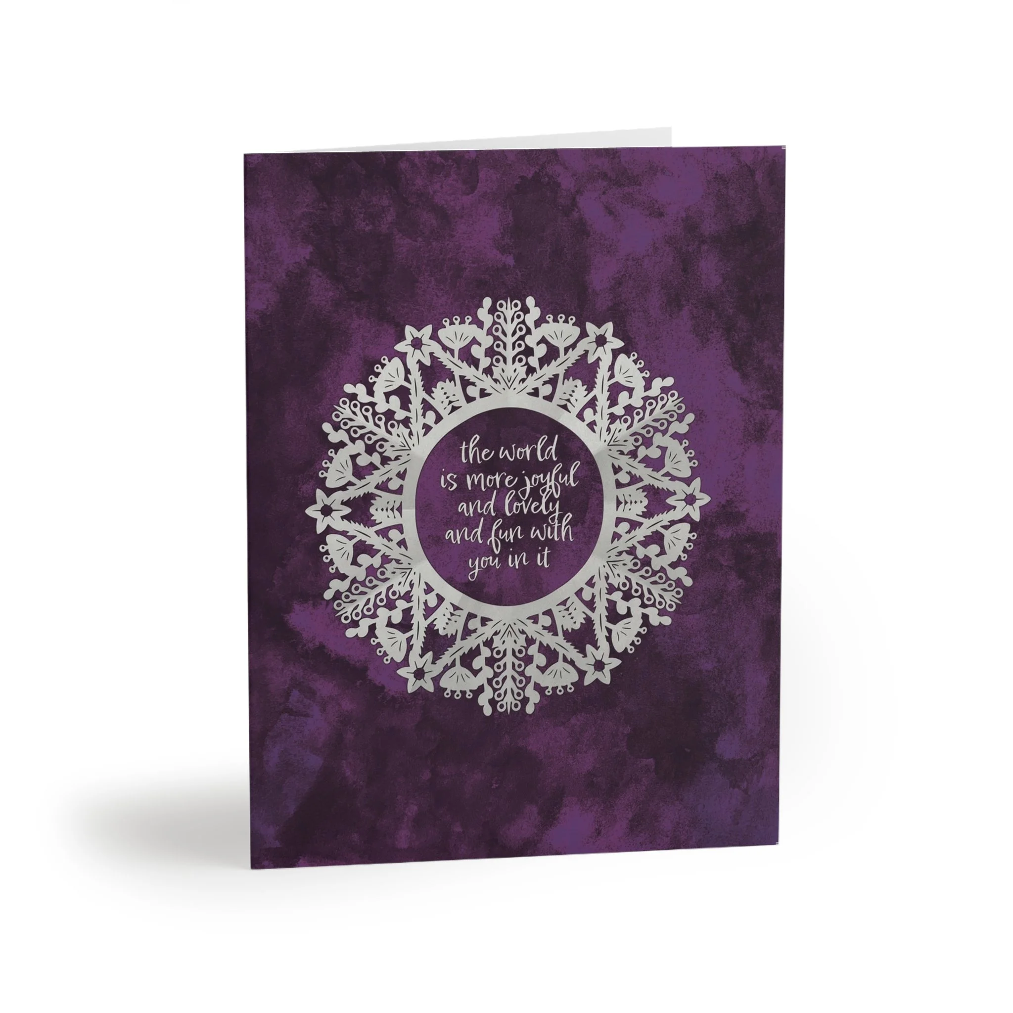 Your unique messages deserve unique greeting cards! These paper snowflake cards measure 4.25” x 5.5” and are printed on uncoated cardstock (easy to write on!) and have blank insides for your own personal message.