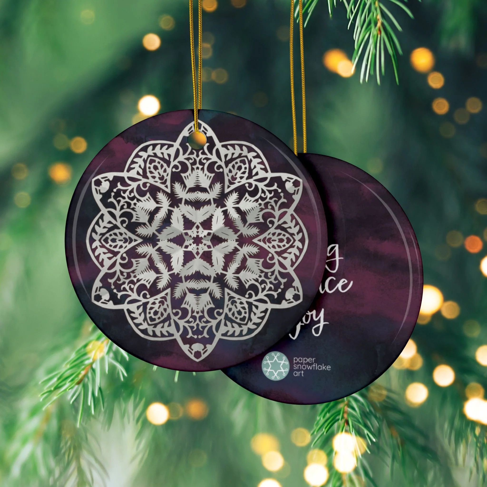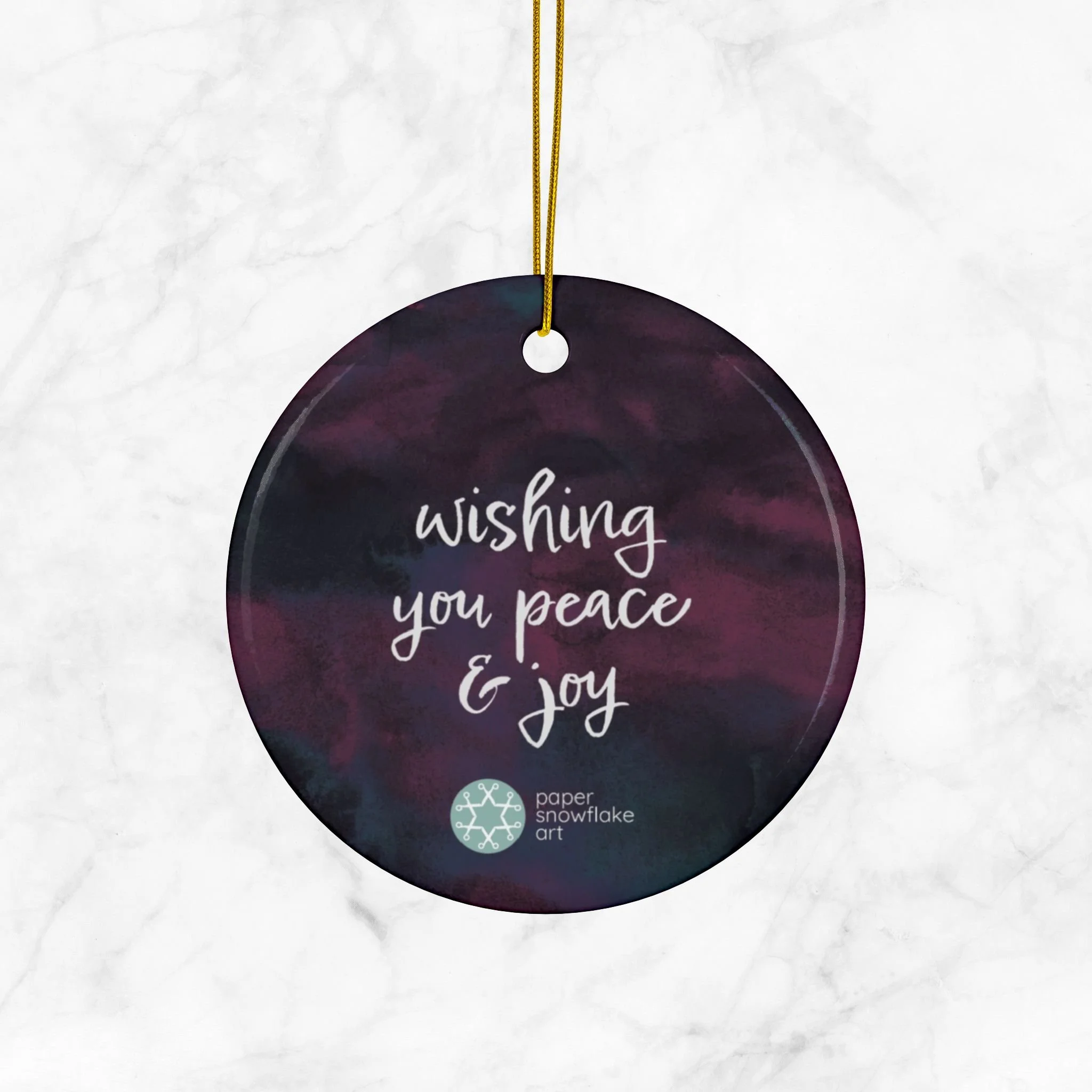 Let your loved ones know you care with this double-sided paper snowflake ceramic ornament that features the quote, "wishing you peace & joy" on the reverse.